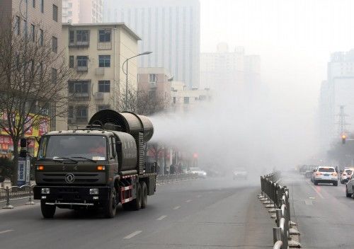 事情就發(fā)生在1月5日,河南省鄭州市經(jīng)三路上出現(xiàn)一輛大卡車,車上拉著一個(gè)大炮筒。工作人員說,這是一輛多功能抑塵車,俗稱“霧炮車”。“這輛車能裝10噸水,供霧炮噴射75分鐘。”工程師張國強(qiáng)說,霧炮車噴射的水霧顆粒達(dá)到微米級(jí),能有效分解空氣中的污染顆粒物、塵埃等,有效緩解霧霾。